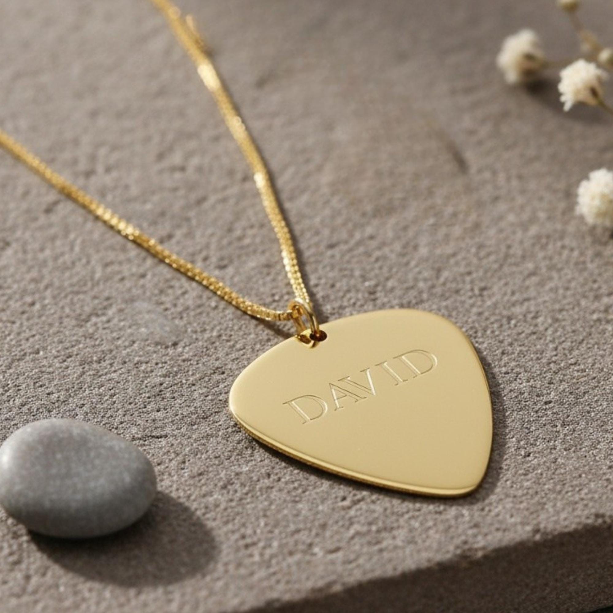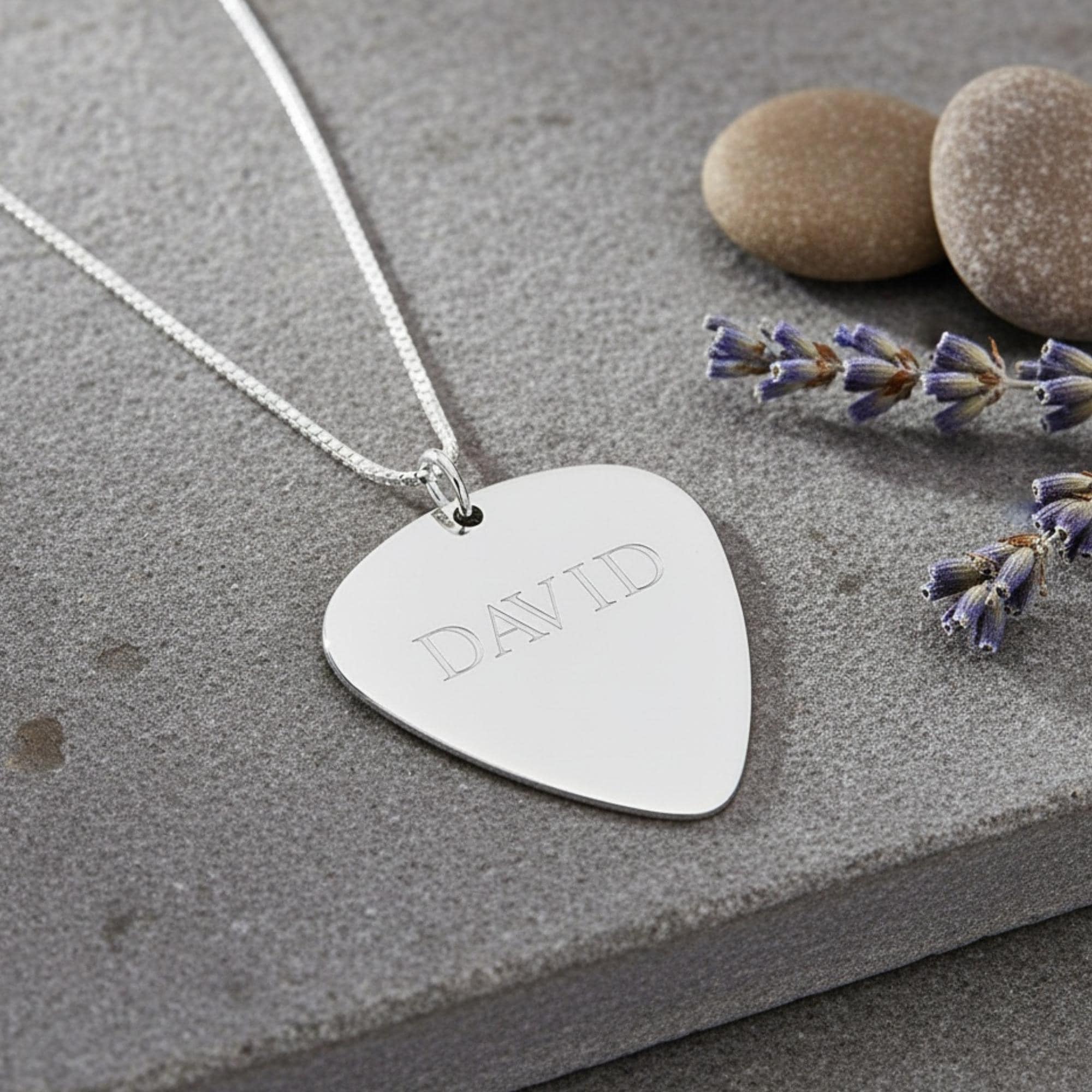 This personalized guitar pick necklace is handcrafted from solid 925 sterling silver and designed for musicians, guitar lovers and anyone who feels music in their soul. Engraved with your special message, name or date, it turns a simple pick into a meaningful piece of jewelry.