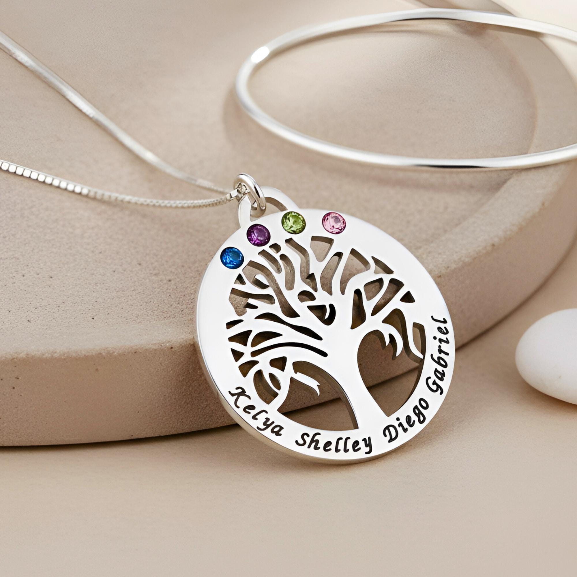 🌳 This beautiful Tree of Life Necklace celebrates the special bond between a mother and her children. Handcrafted from 925 sterling silver, this family tree necklace features a round pendant that can be engraved with up to 6 names and their corresponding birthstones.