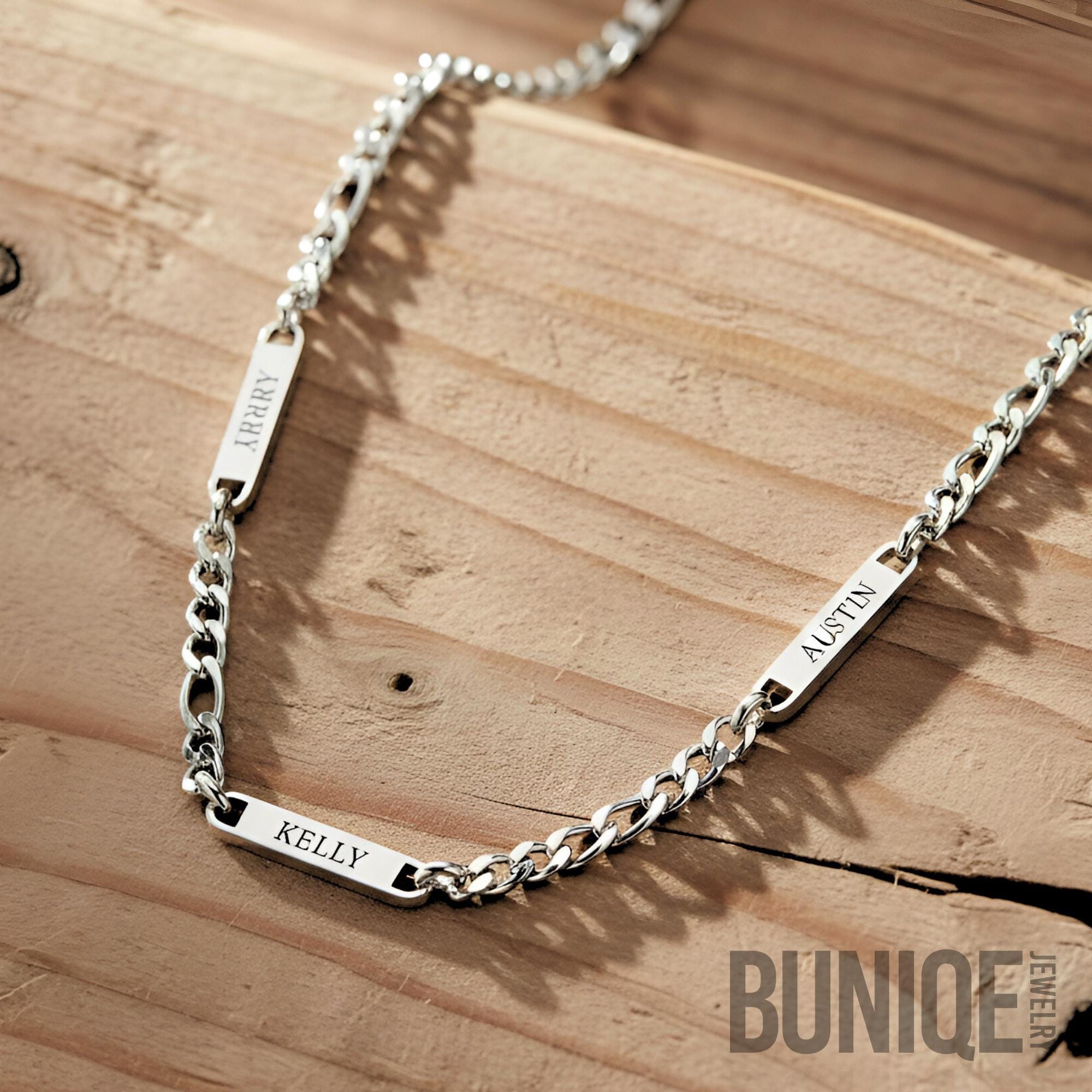 Crafted from premium stainless steel, each bar pendant is engraved with your children's names, creating a meaningful accessory perfect for any dad.