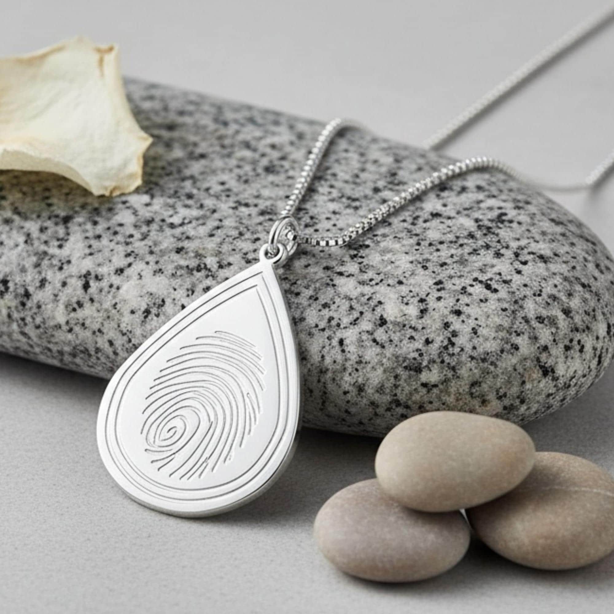 This elegant keepsake is crafted from high-quality 925 sterling silver, with luxurious options of 24K gold or rose gold plating, and features a delicate fingerprint engraving on a teardrop-shaped pendant.