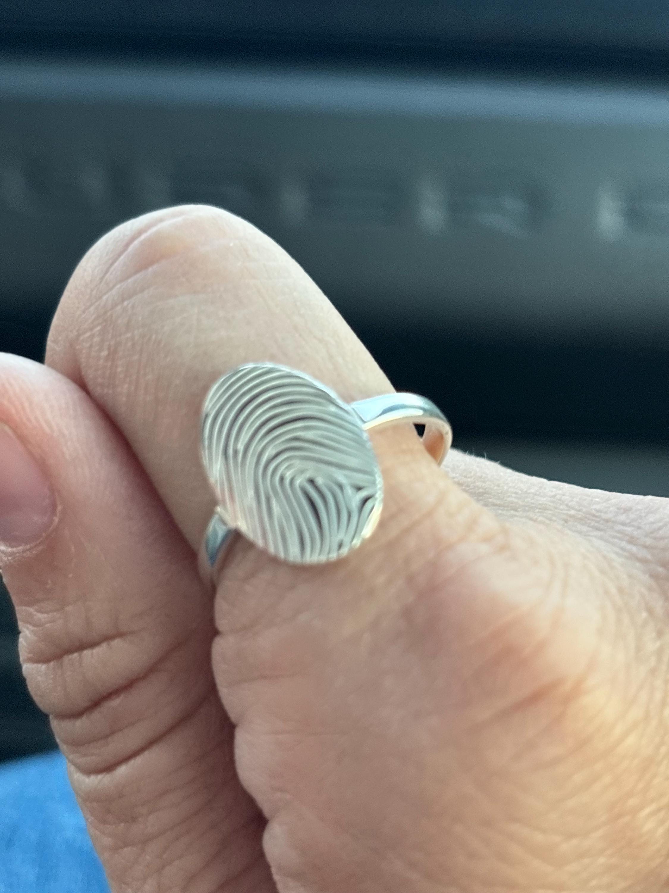 I love my ring!!! We lost our son unexpectedly and I knew I wanted this ring the moment I saw it. We did not have great fingerprints, and the funeral home was only able to get 4 decent prints. I opened my package last night and the ring is beautiful, better than I even hoped for. I can’t believe how well it turned out. I immediately put it on my index finger, and now I can place my thumb on my ring and ‘hold his hand again’. Thank you for my ring.