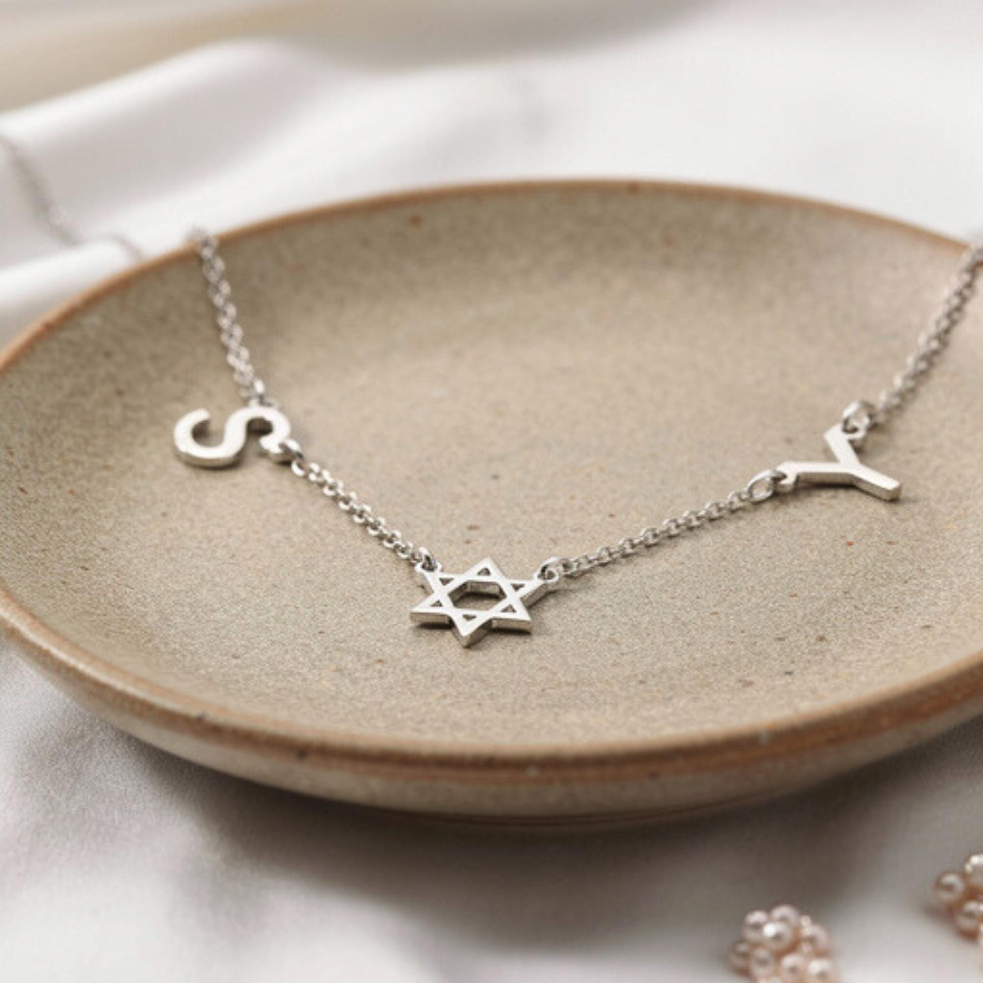 This elegant piece combines two custom initials with a meaningful Star of David charm in between, adding both style and significance.