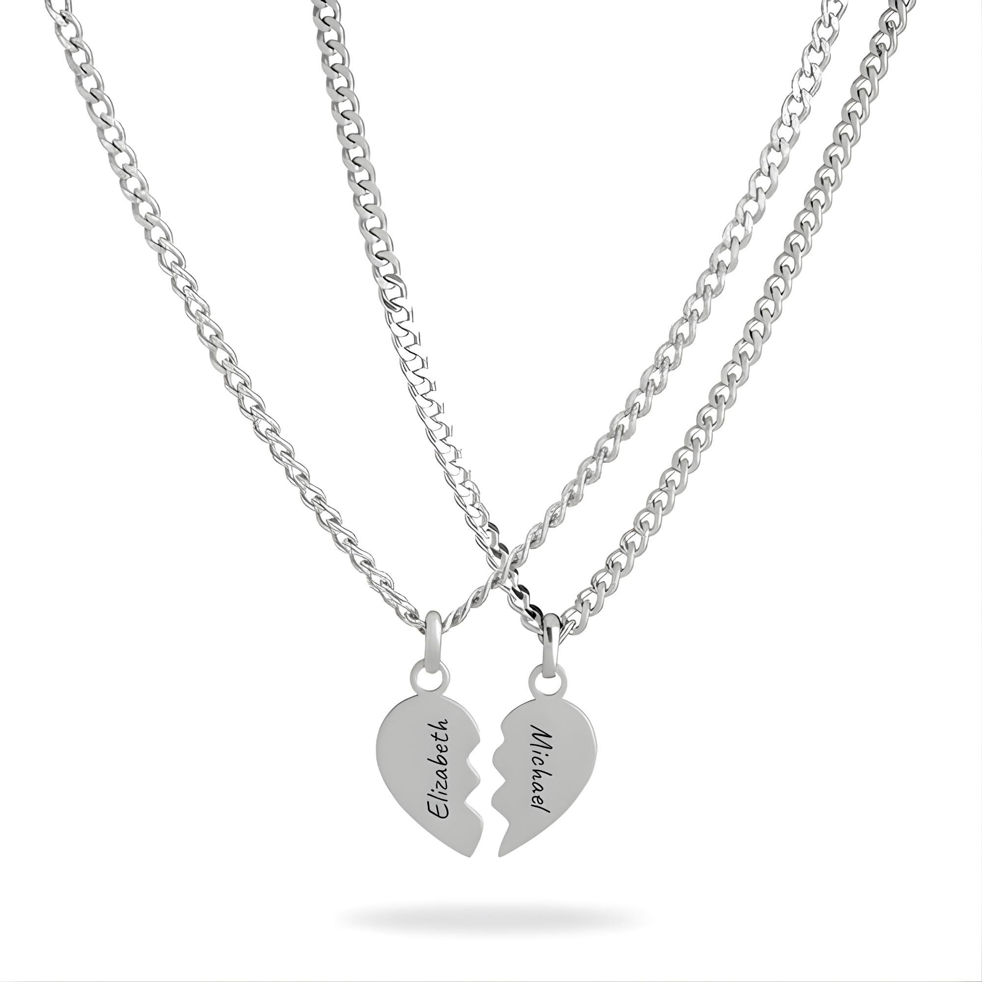 Each necklace forms half of a heart, symbolizing love, connection, and togetherness, and can be personalized with names, initials, or a meaningful word in elegant cursive engraving.