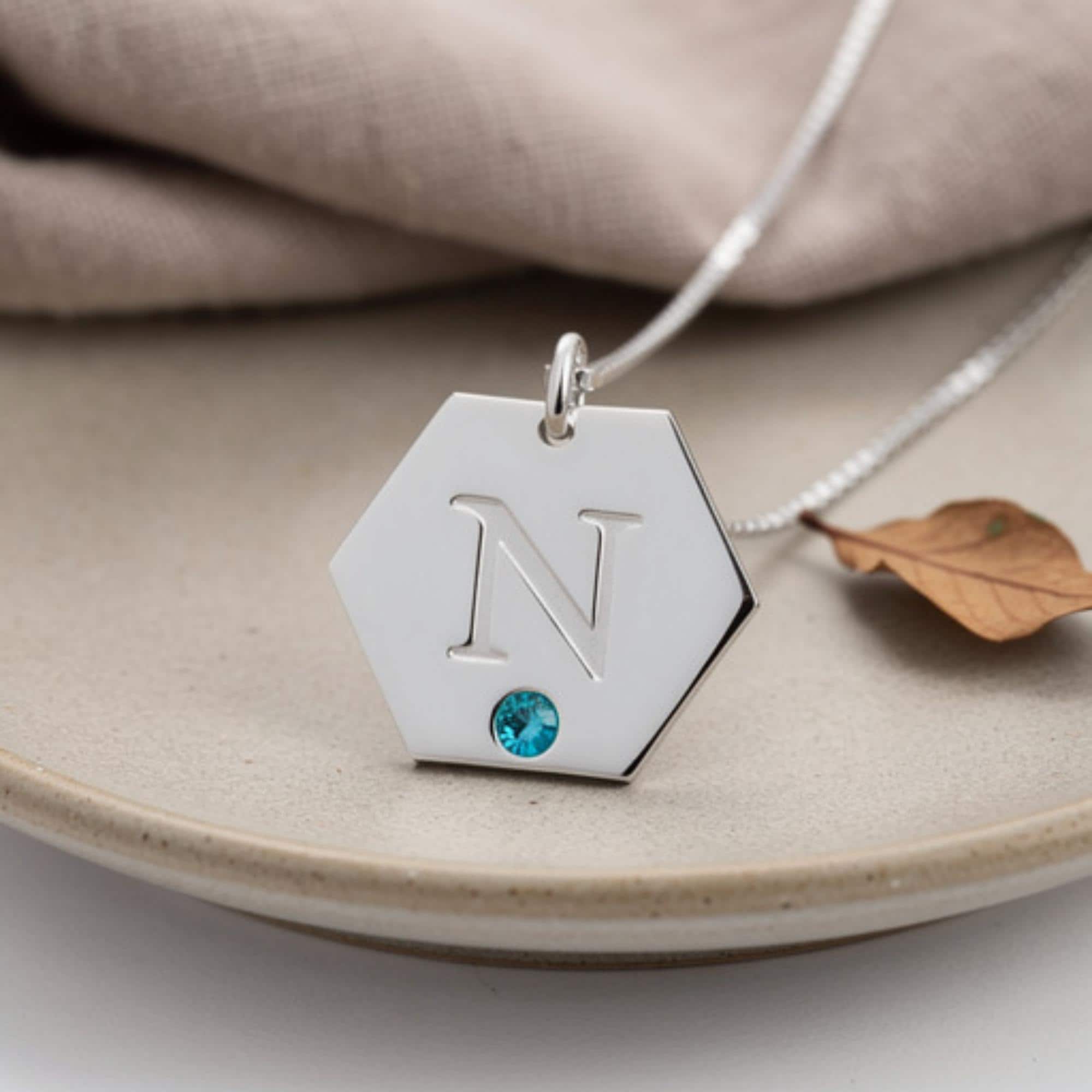 💎 This Initial Hexagon Necklace with Birthstone is a modern, elegant, personalized piece that combines geometric beauty with sentimental value.