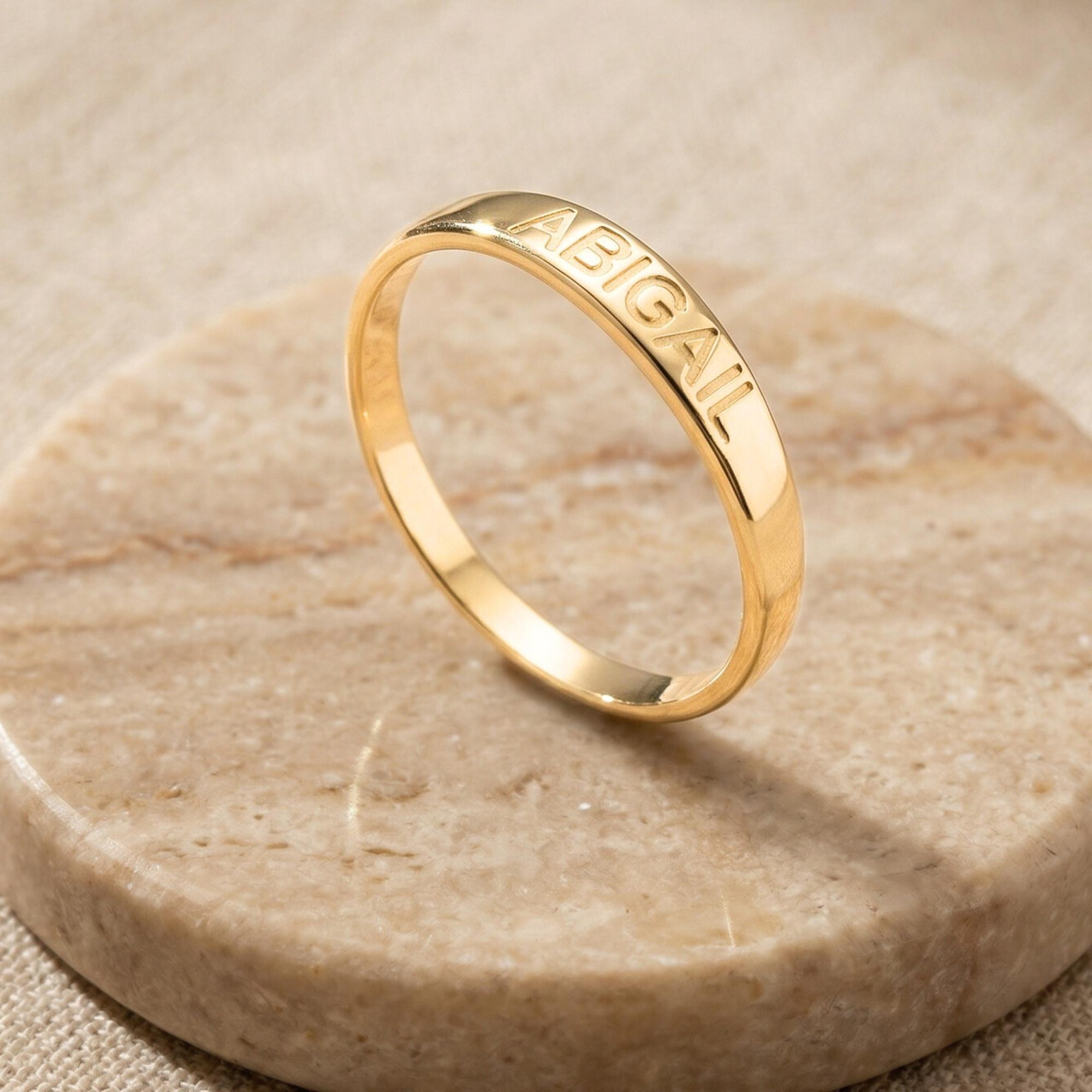 This thin 3mm band is custom engraved with your chosen name, word, or initials, creating a timeless and meaningful piece you’ll never want to take off.