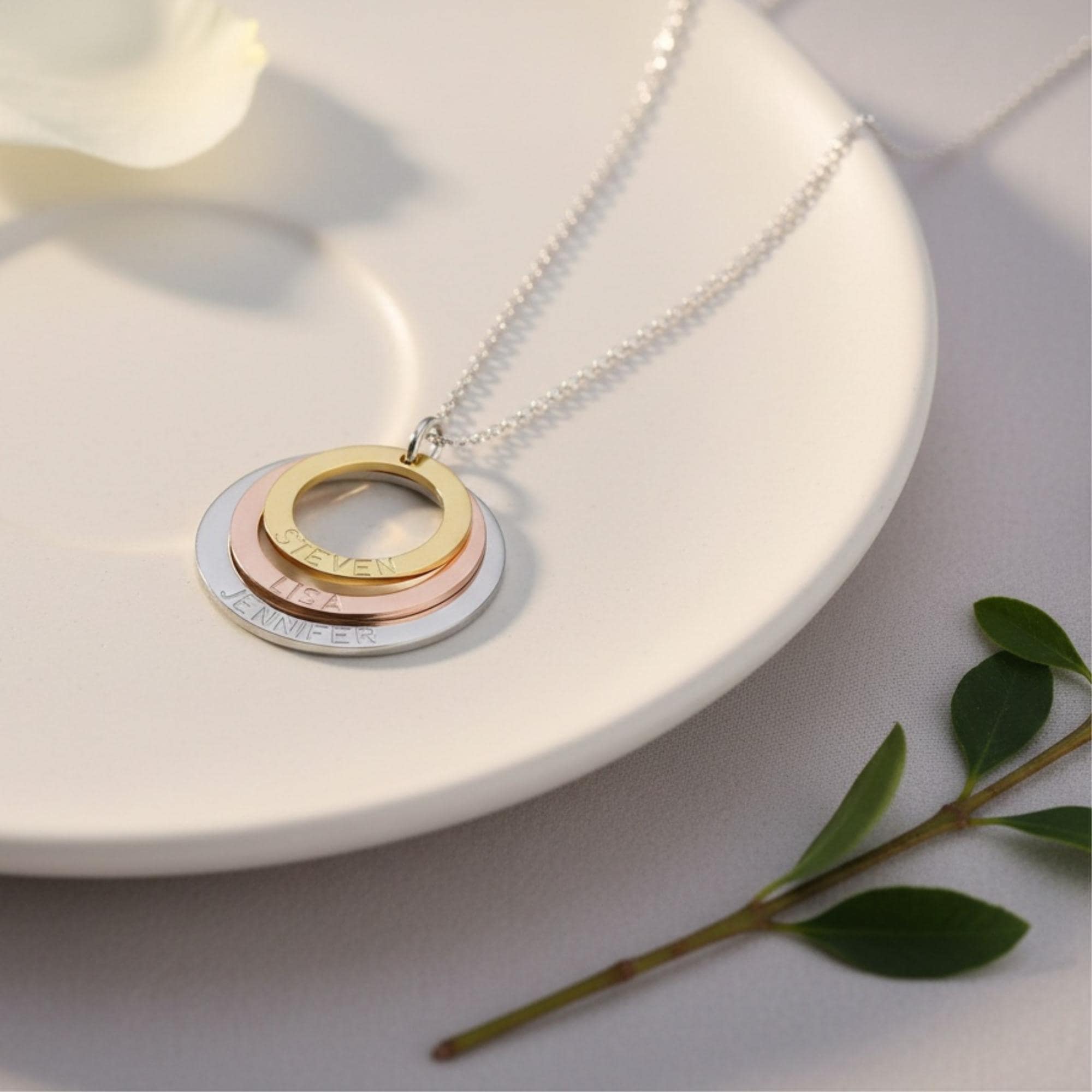 This personalized necklace, designed in an elegant three-tone style, features three circle pendants, each engraved with a child's or grandchild's name.