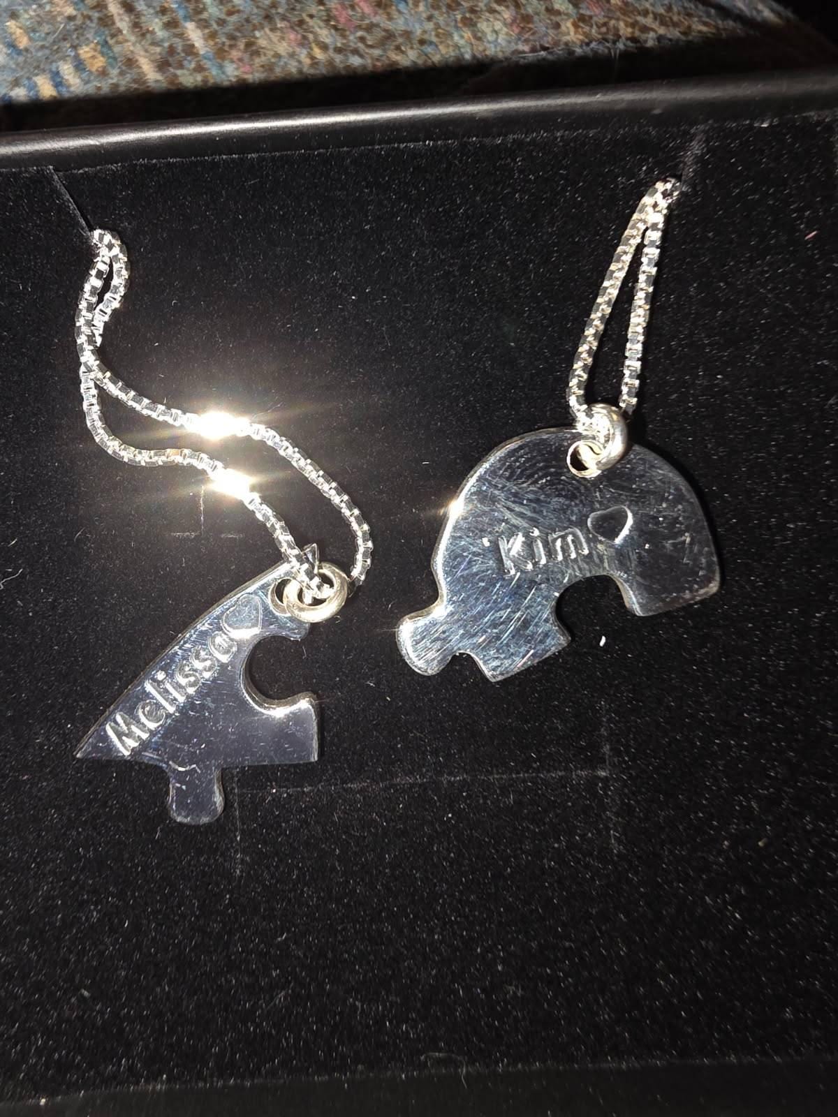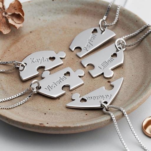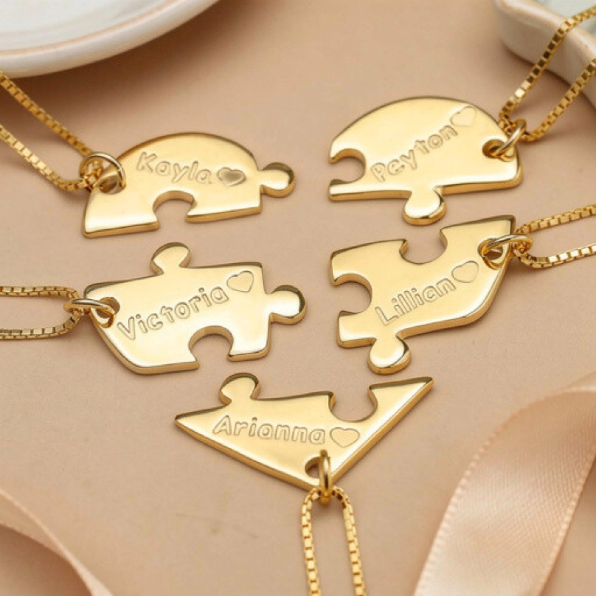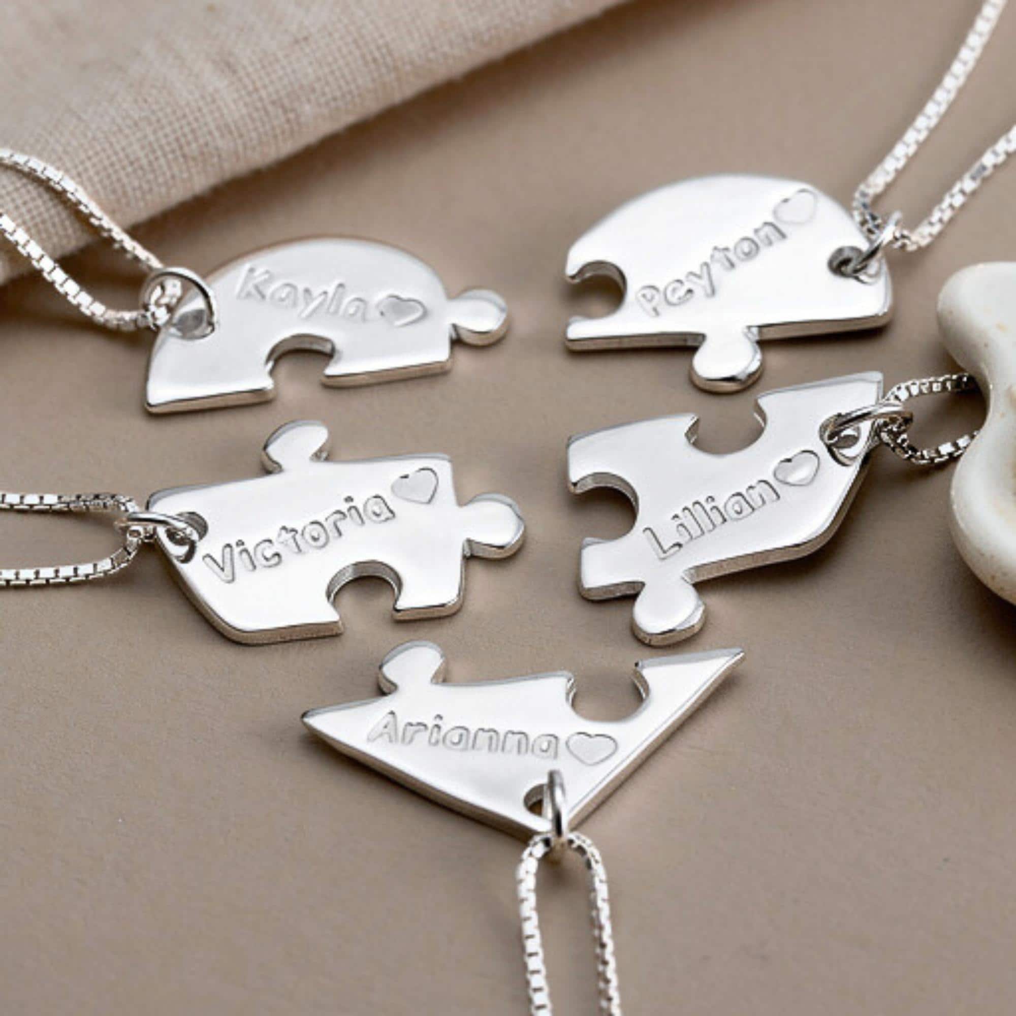 Each puzzle piece is engraved with a personalized name and a cute heart sign; this matching necklace set is an ideal gift for sisters, best friends, or family members who share a special connection.