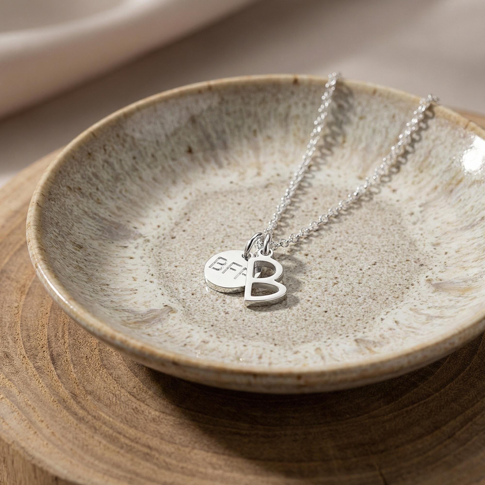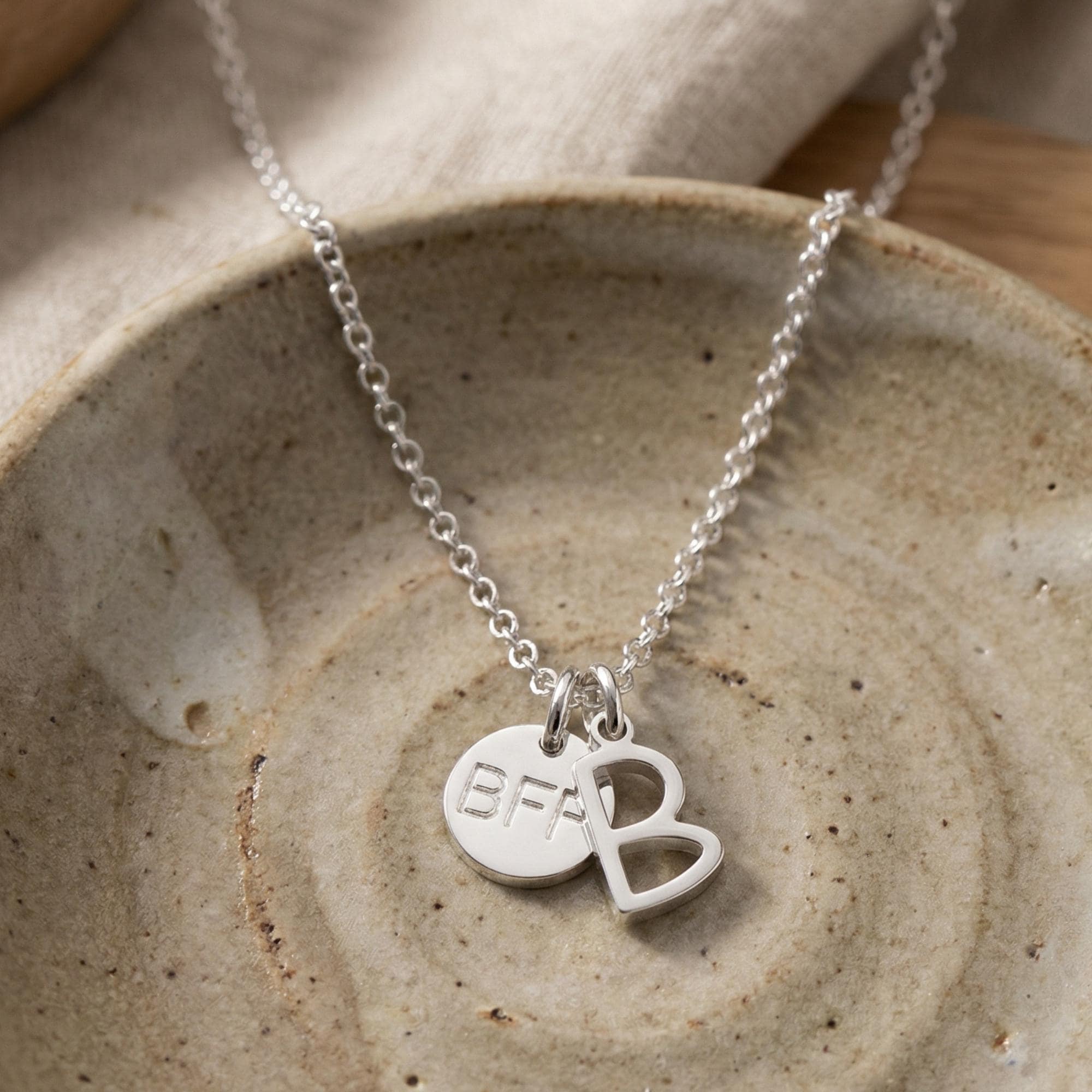 💎 Celebrate your special bond with this personalized BFF initial necklace, featuring two meaningful charms: one custom letter charm and one engraved BFF disc.