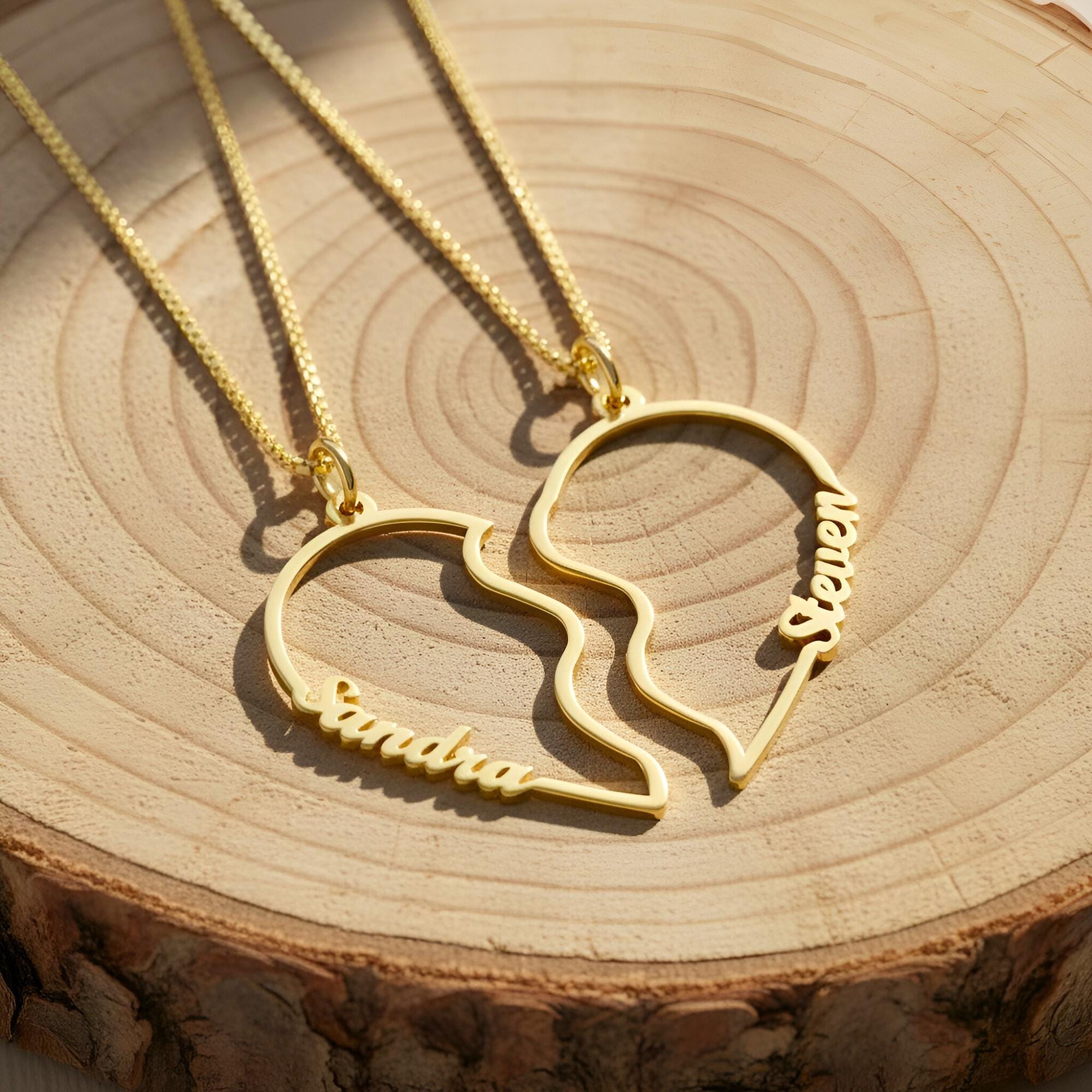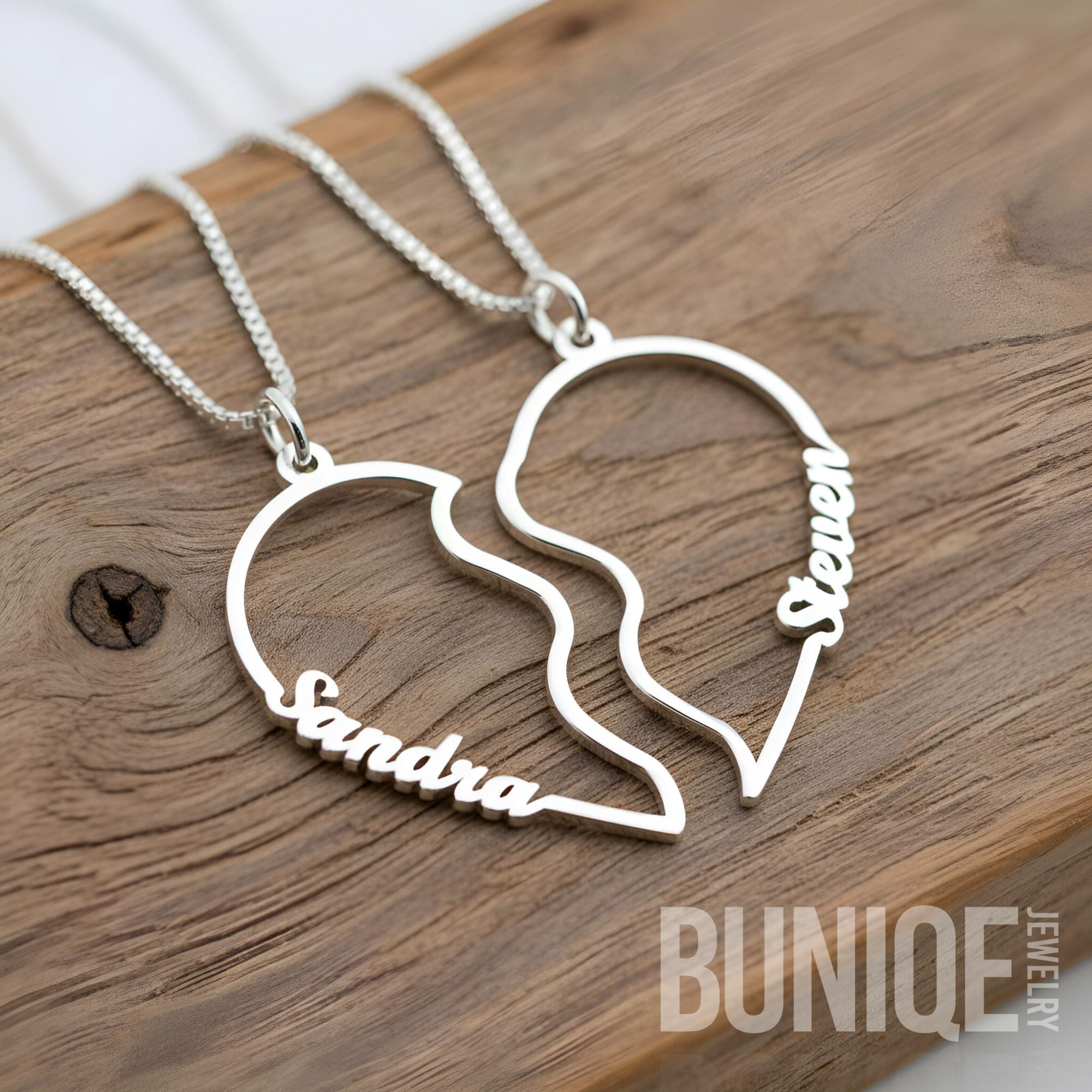 💔 Stay connected with your loved one no matter where life takes you with this His & Hers Broken Heart Necklace Set. Featuring two halves of a heart, each piece is engraved with a custom name in an elegant cursive font, creating a sentimental and significant jewelry set.