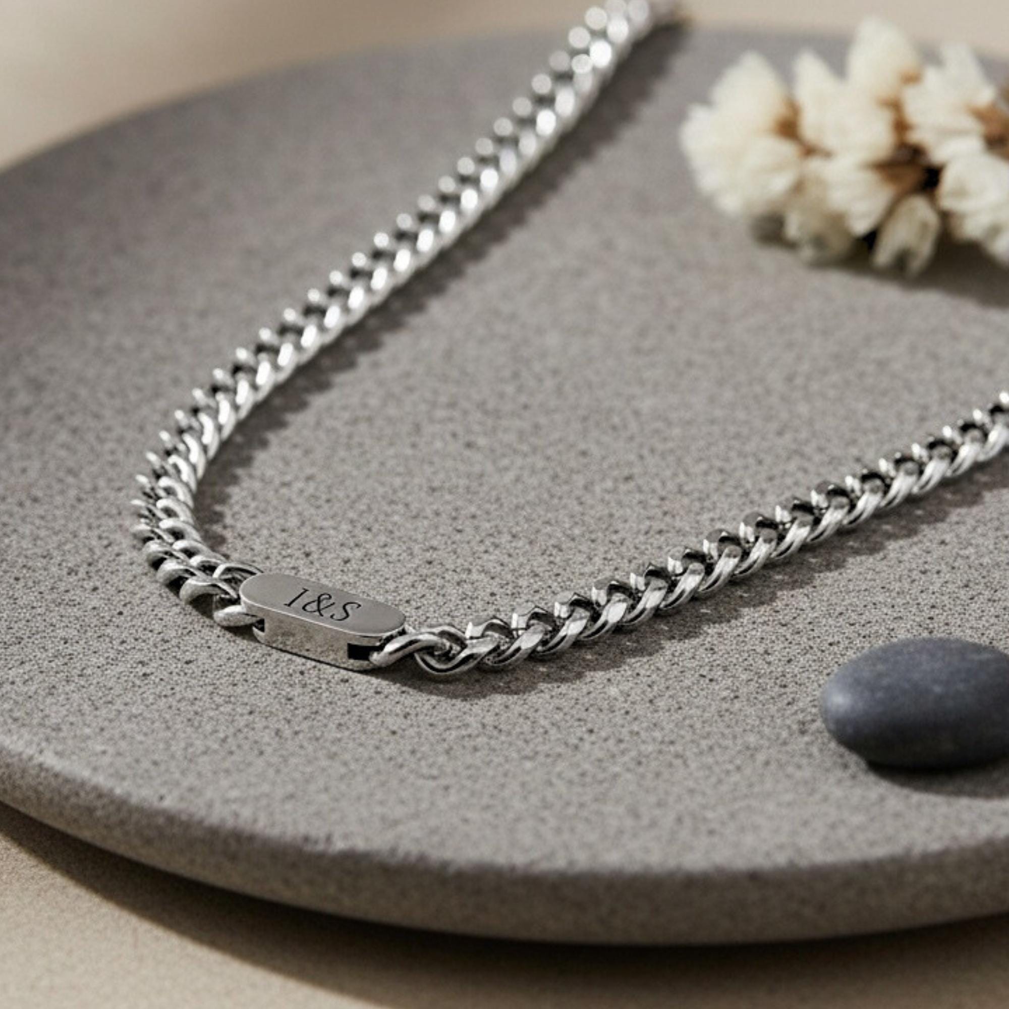 Featuring a rugged yet refined Cuban Link Chain and a sleek 20 mm stainless steel tag, this piece is custom engraved with the name, date, or word that matters most to you or someone you love.