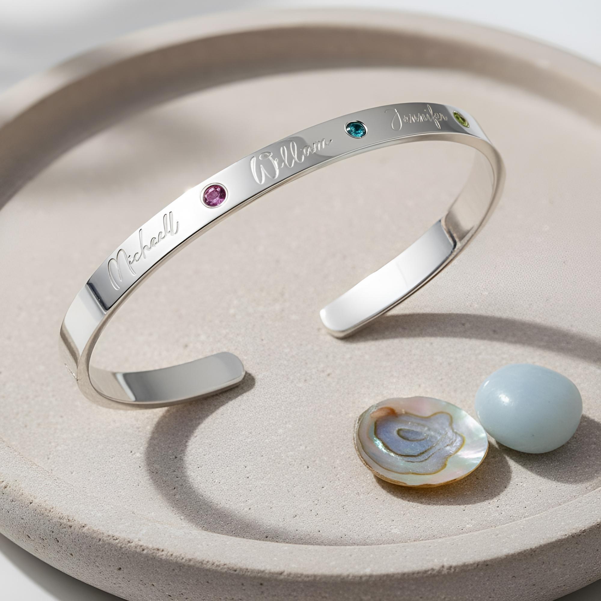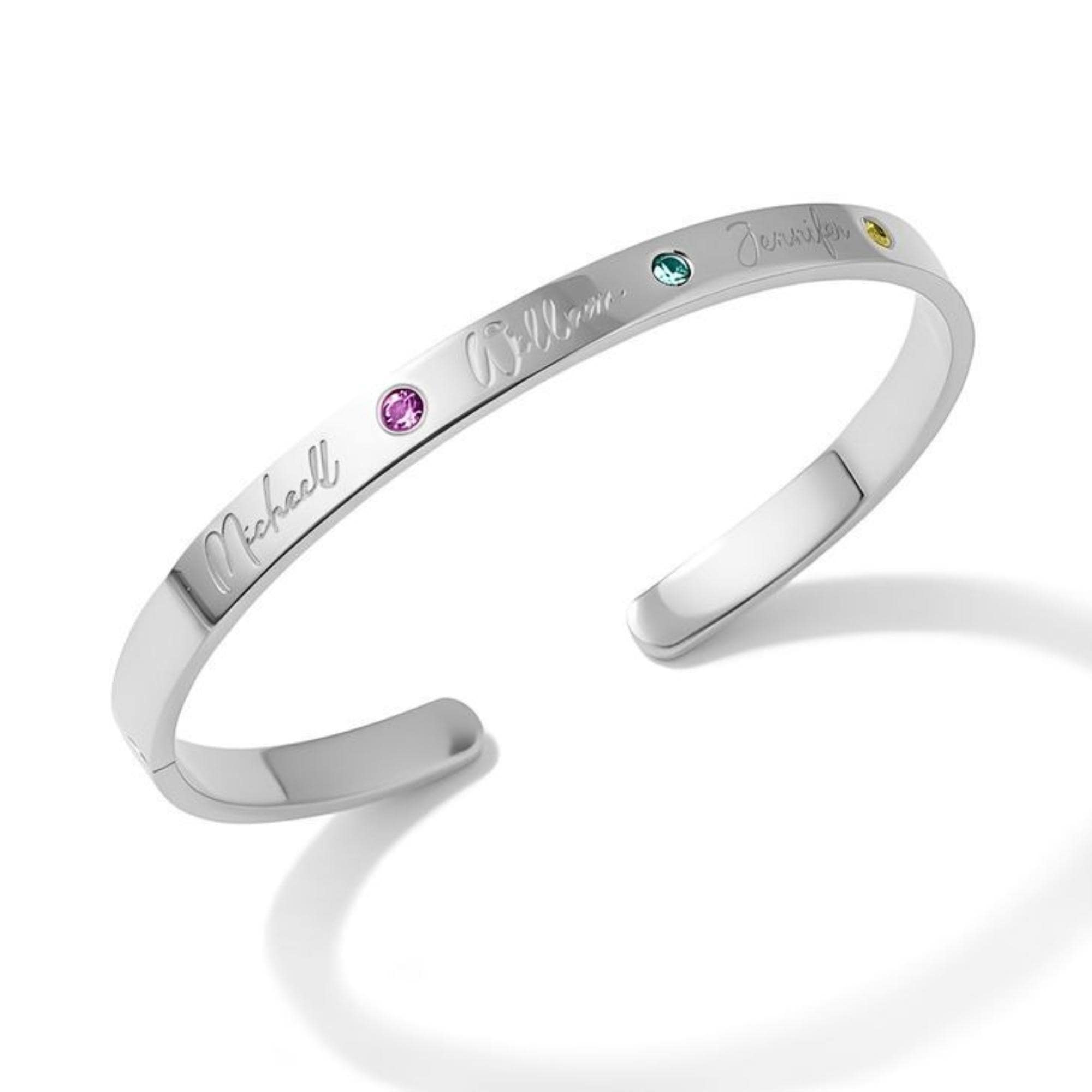 Unique Bangle bracelet for Moms made from solid sterling silver 925. Cuff Bracelet is engraveable with kids' names and birthstones.