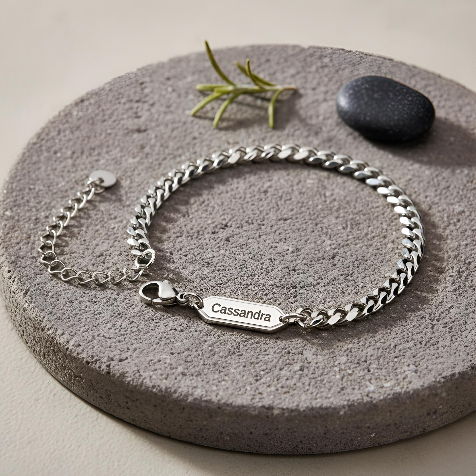Give it as a meaningful gift for Him. This Custom Name Cuban Bracelet is designed with a bold engraved tag pendant on a durable Cuban link chain.