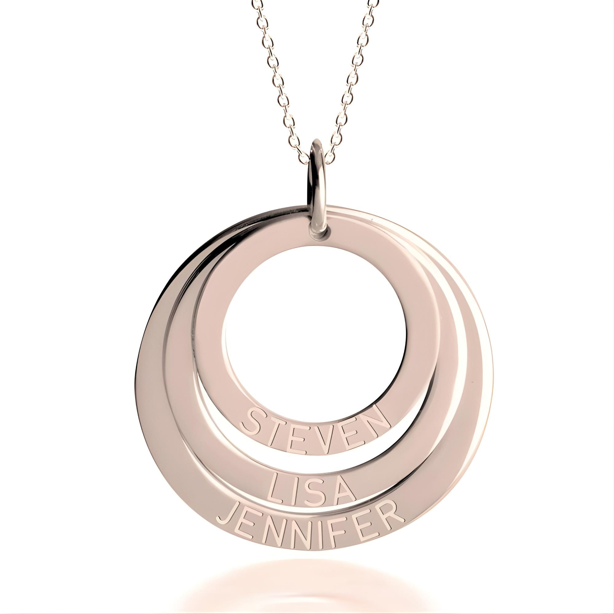 Handcrafted from 925 Sterling Silver, 24K Gold Plated, or Rose Gold Plated, each necklace features up to five interlocking circle pendants, symbolizing an unbreakable bond between a mother and her children.