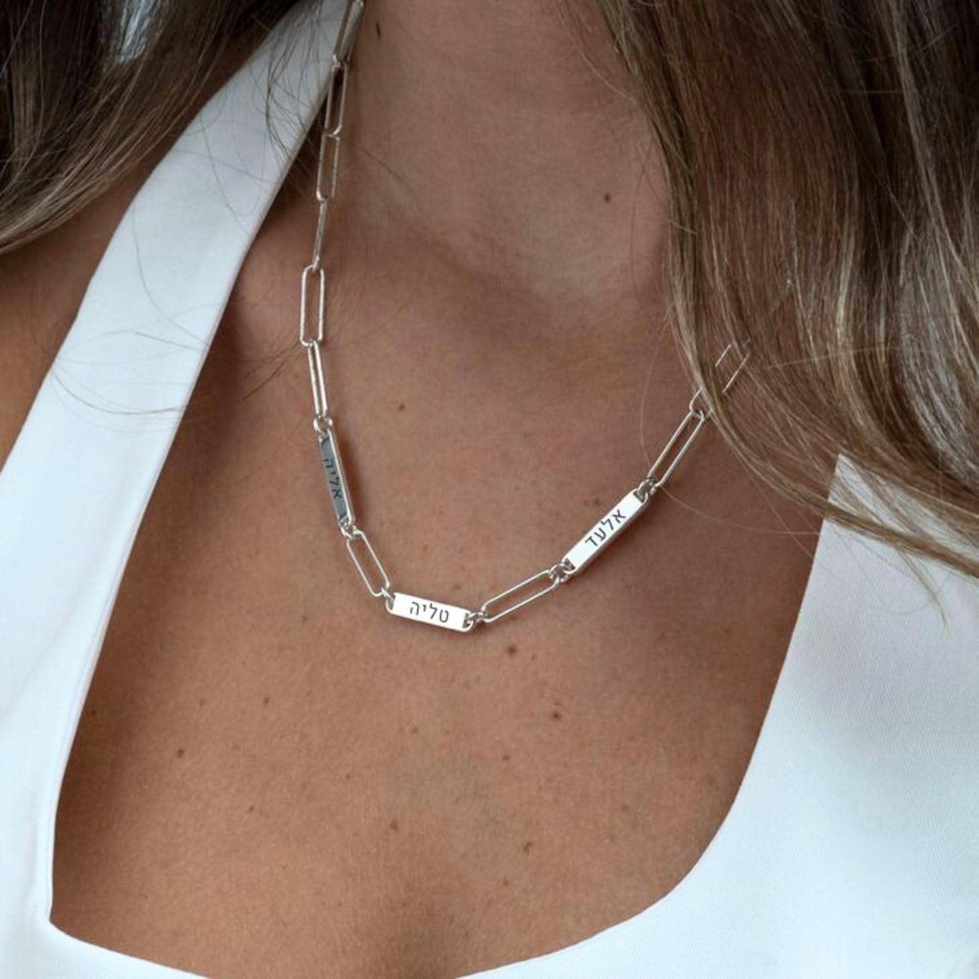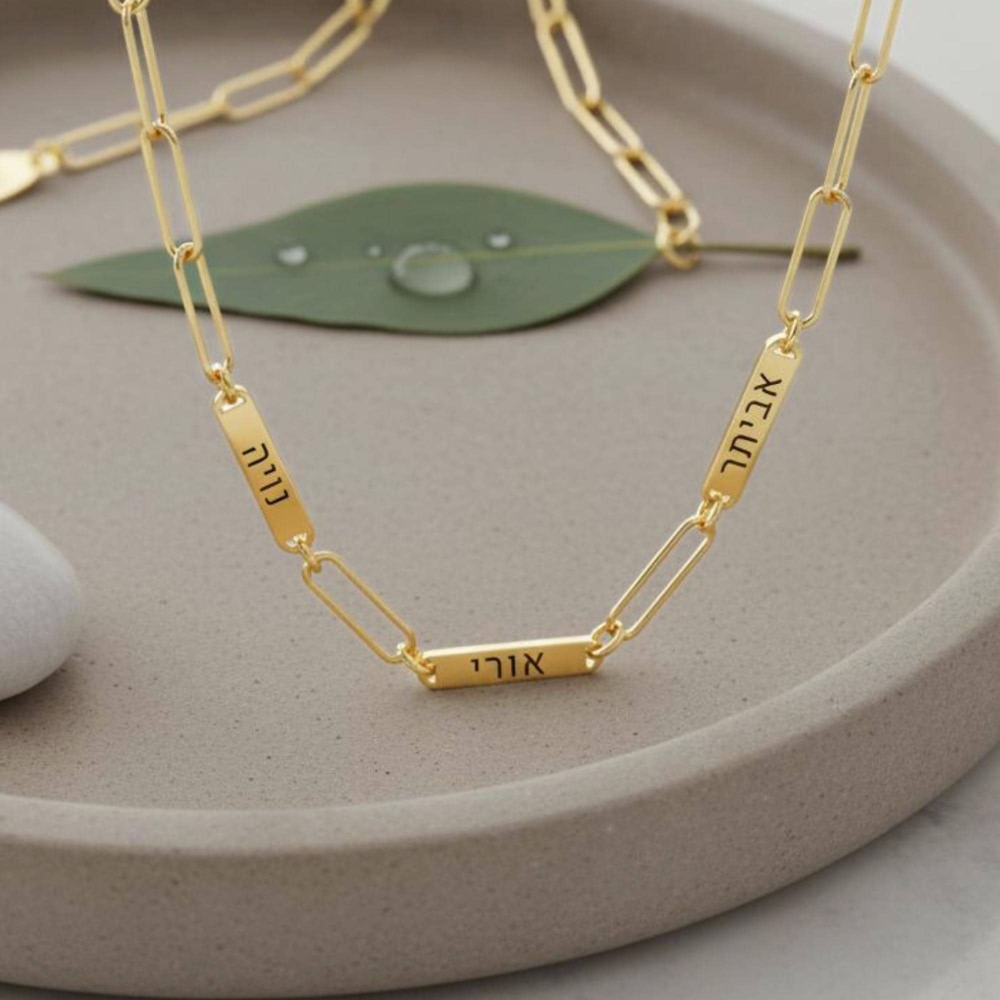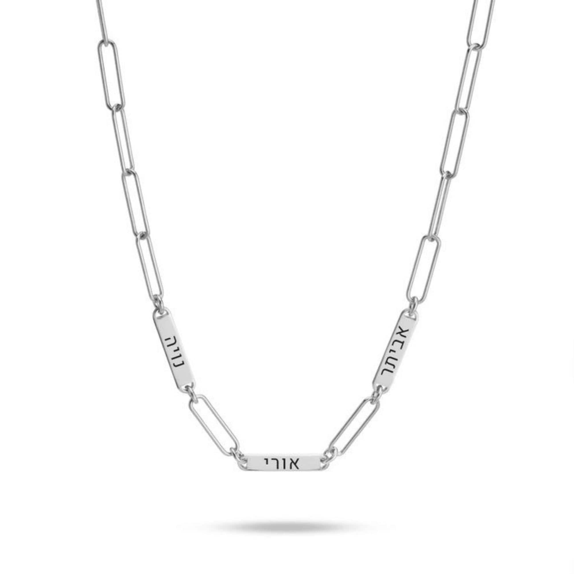 • Style: Multiple Hebrew Name Necklace – Paperclip Chain, Custom Engraved Kids Names