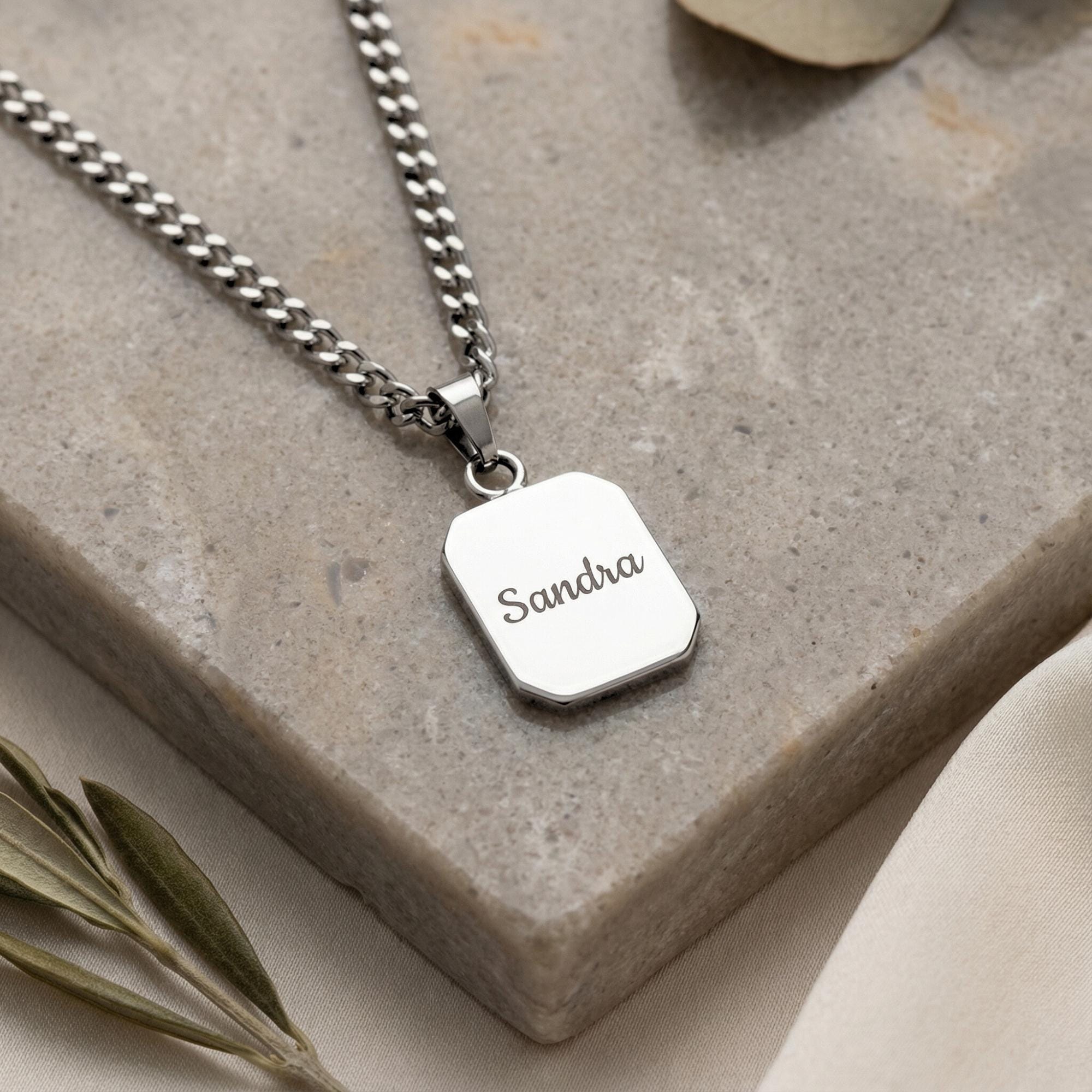 Made from durable stainless steel in silver or gold, it hangs on a bold curb chain, offering a clean, modern look — perfect for him or her.